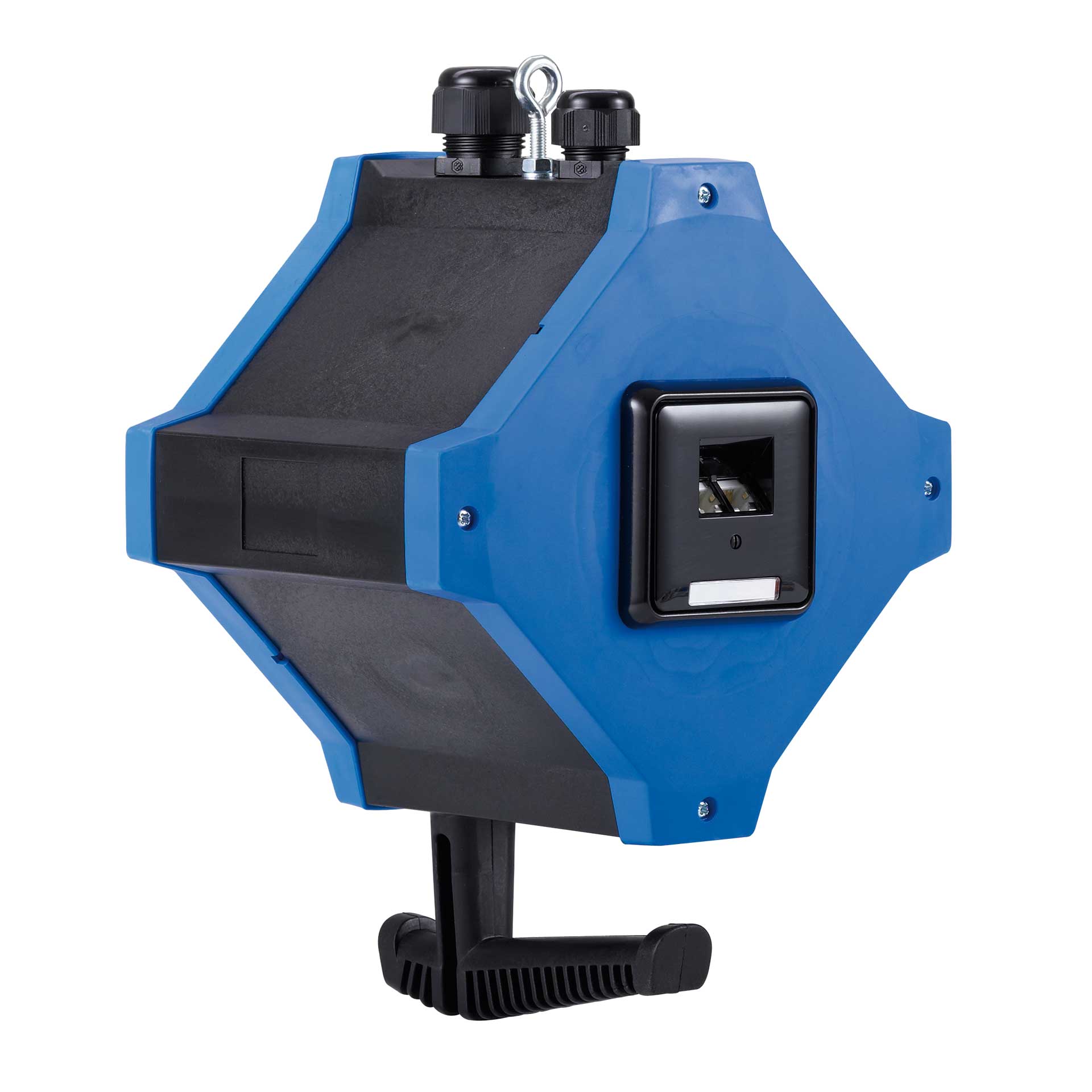 Für zusätzliche Widerstandsfähigkeit sind Vorder- und Rückseite in blauem Gummimaterial ausgeführt. Auf der Oberseite befindet sich ein Aufhängehaken zur Befestigung der im Lieferumfang enthaltenen Knotenkette, die per Karabiner eingehängt wird. So lässt sich die e.STATION schnell und sicher über Kopf positionieren, etwa an Gerüsten, Trägern oder Montagepunkten, und bleibt dabei gut erreichbar.