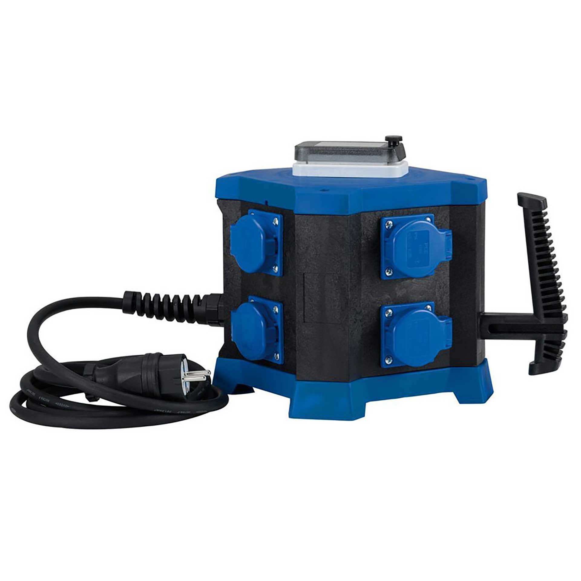 Der Verteiler ist auf eine hohe mechanische Belastbarkeit ausgelegt: Das Gehäuse aus glasfaserverstärktem Kunststoff sorgt für Stabilität, während gummierte Flächen und Standfüße die Positionierung auf wechselnden Untergründen erleichtern und ein Verrutschen reduzieren. Die integrierten Schutzkontakt-Steckdosen sind spritzwassergeschützt ausgeführt und mit selbstschließenden Deckeln versehen. Das unterstützt einen sicheren Betrieb, wenn der Verteiler im Innen- und Außenbereich genutzt wird.